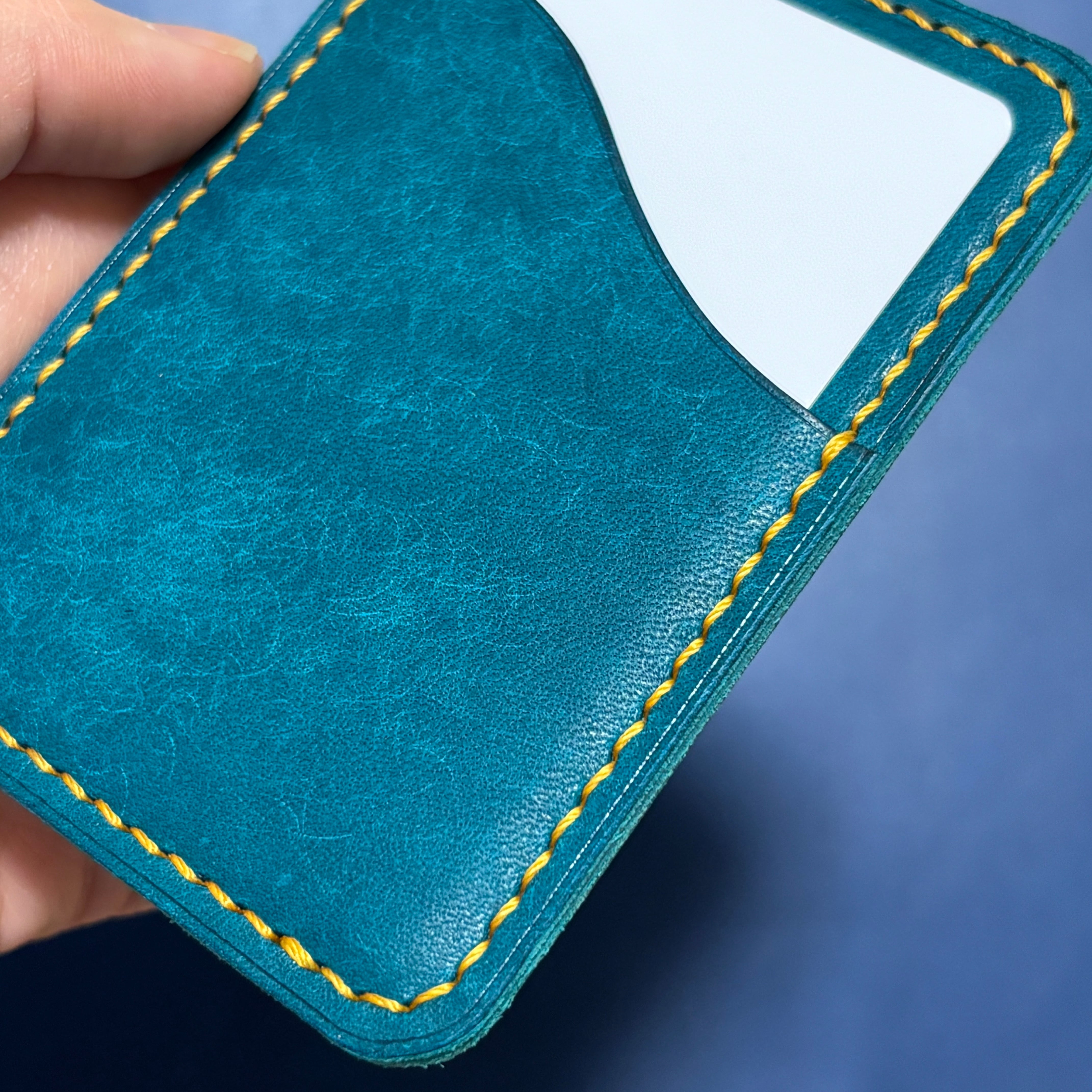 ※こちらの商品は販売済みです 現在は価格・仕様が変更されている場合がございます。 イタリアンレザー マルゴーを使用した、手縫いで仕上げられた二つ折り財布です。 外側に小銭入れを備えた機能的なデザインで、スムーズに小銭の出し入れが可能です。財布を開かなくても、すぐにアクセスすることができます。 日常に彩りを添える一品として、ぜひお手に取ってみてください。 カードは最大9枚(カードポケット6枚、隠しポケット3枚)、コインは20枚程度入れることができます。カードポケットはクレジットカード(54mm×85mm)がピッタリ入るようになっております。お札を入れるスペースもございます。カードポケットや小銭入れの裏側にある隠しポケットには、名刺サイズ(55mm×91mm)のカードも入れることができます。 革の色:ターコイズブルー、ダークブラウン 糸の色:ターコイズブルー 重量:約104g 厚さ:30mm(折りたたみ時) ホック:日本製バネホック 【使用している革】 Virgilio Conceria Artigiana(ヴィルジリオ・コンチェリア・アルティジャーナ)社製 タンニン鞣し革のマルゴーを使用しております。 銀面に浅くスクラッチ加工が施された革です。使い始めはツヤ無しで独特な色ムラ感のある表情ですが、エイジング(経年変化)により艶やかな光沢が生まれ、深い色合いが楽しめます。使うほどに手に馴染んでいく感覚をお楽しみいただけます。 ※天然素材のため生前の傷・シワ・汚れが存在し、一枚一枚に風合いの差(個体差)がみられます。