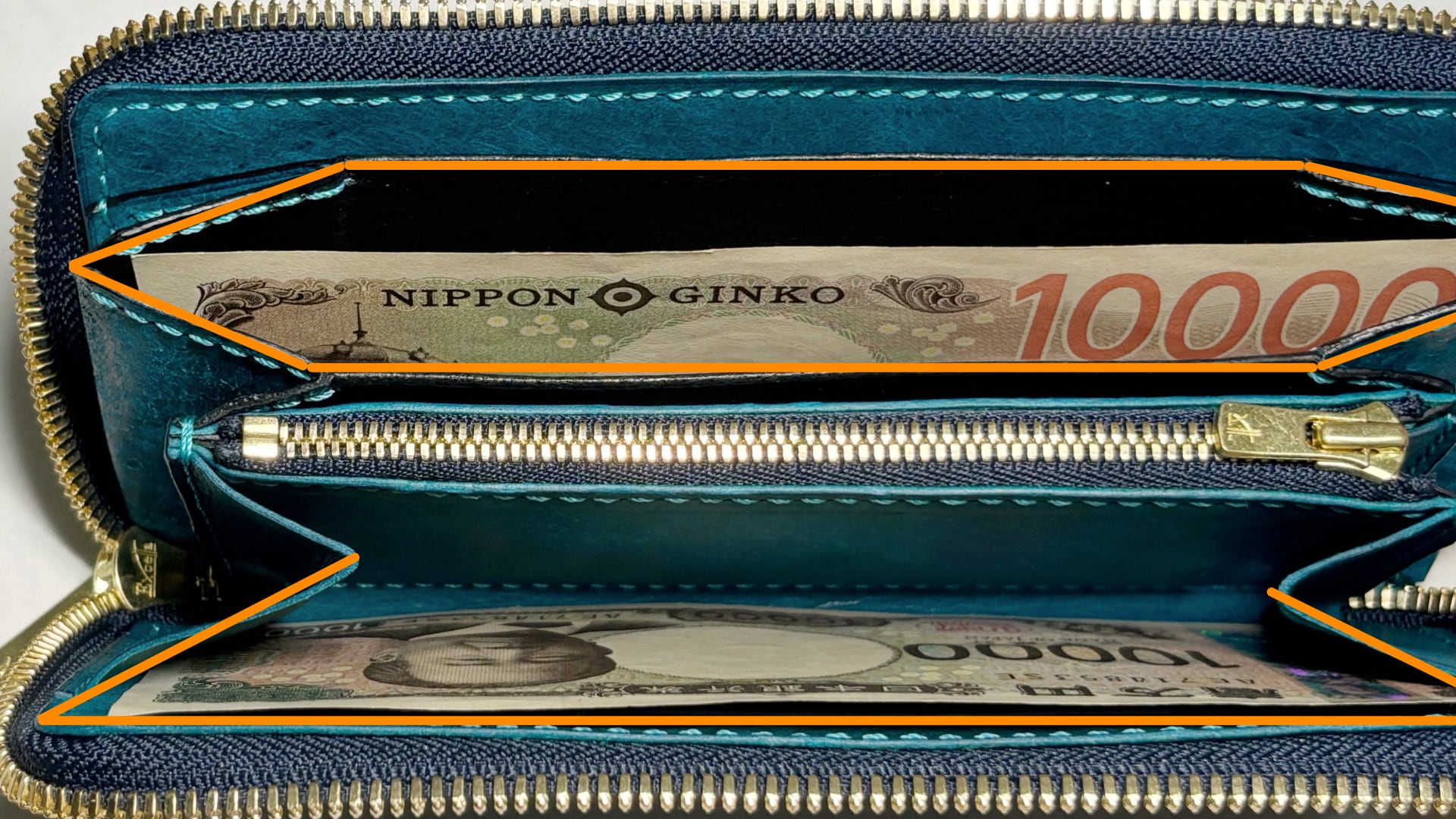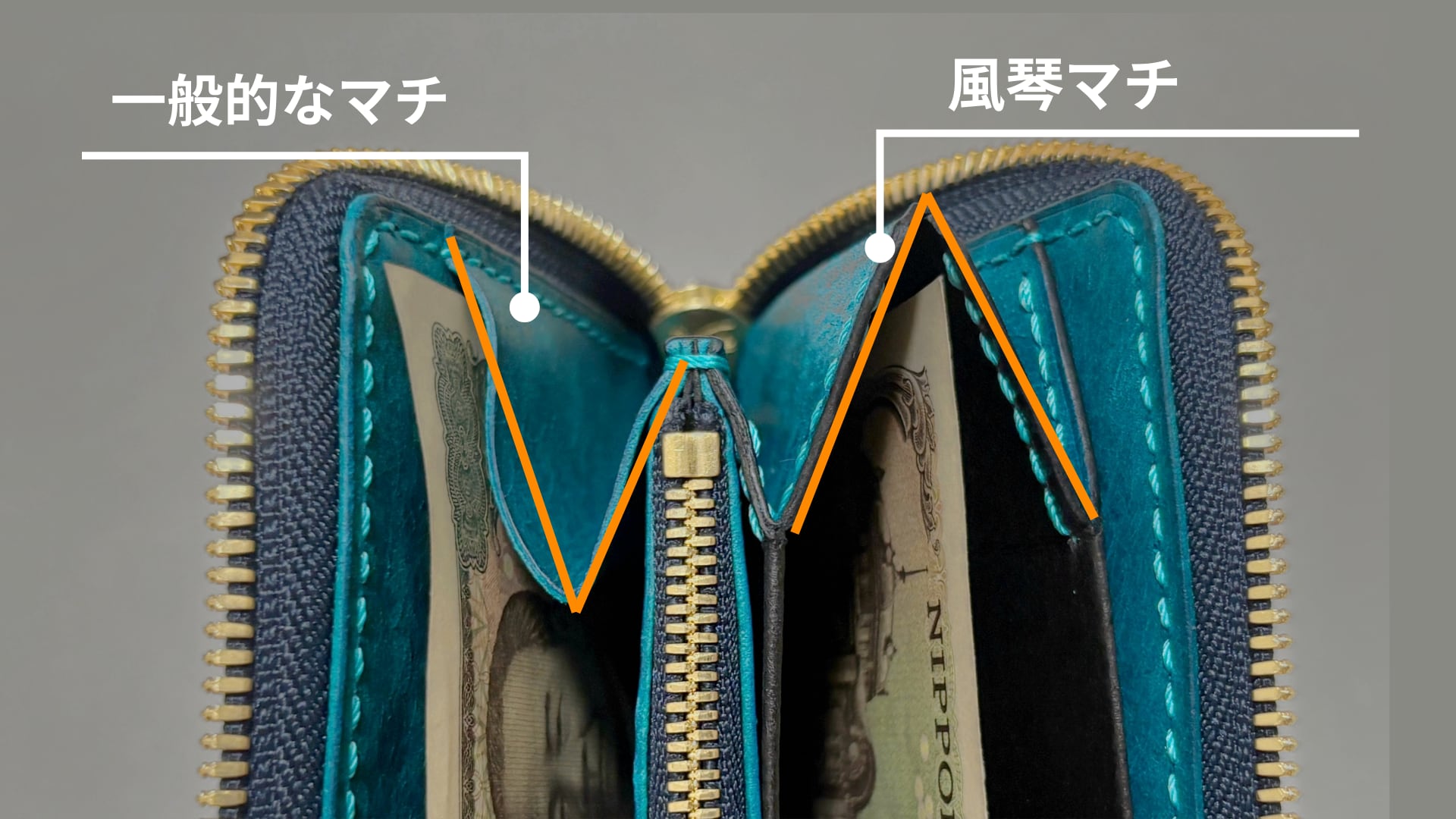 一般的なマチだとお札が端に寄ってしまい出し入れがしにくいですが、風琴マチだとお札が真ん中に集まるため、出し入れがしやすくなっています。