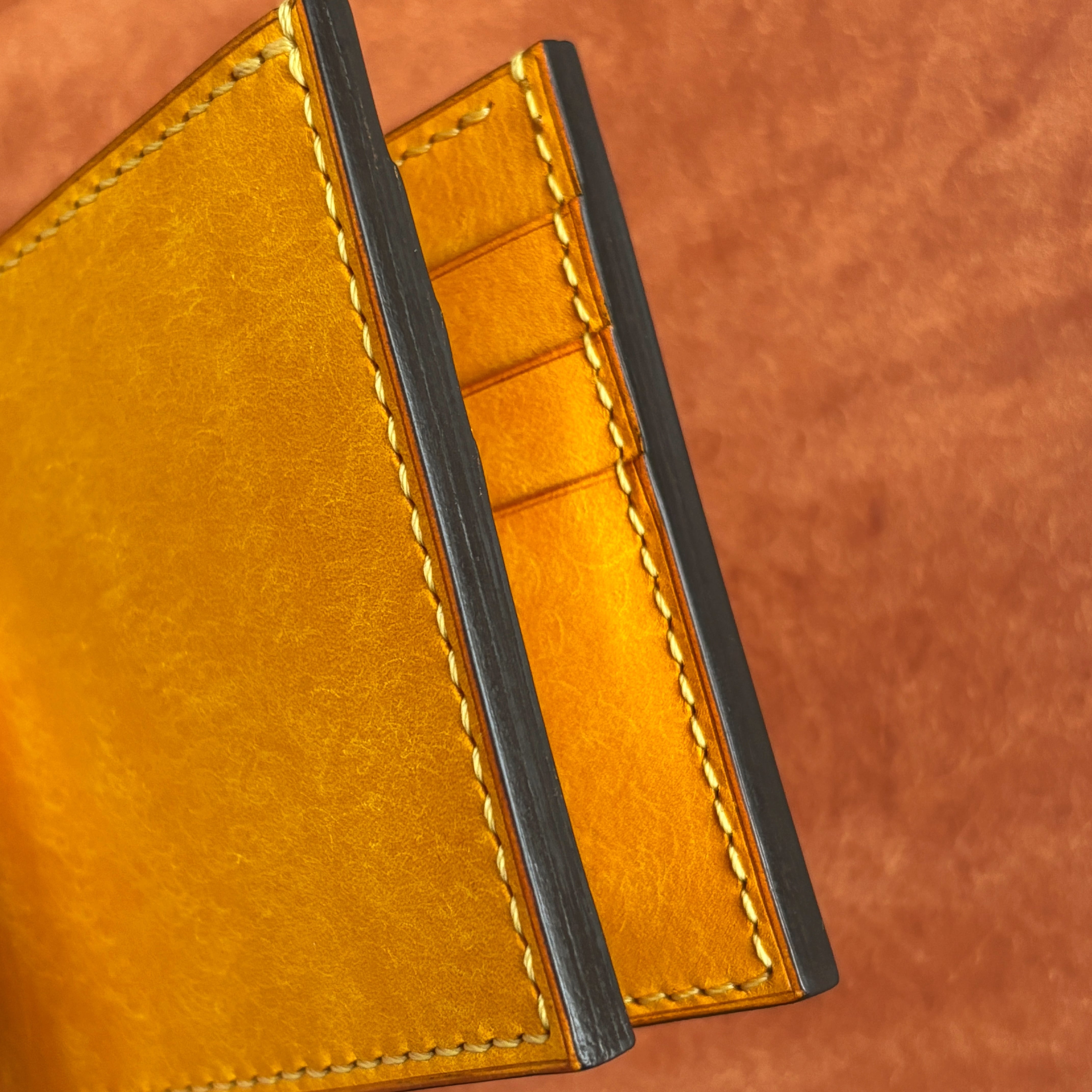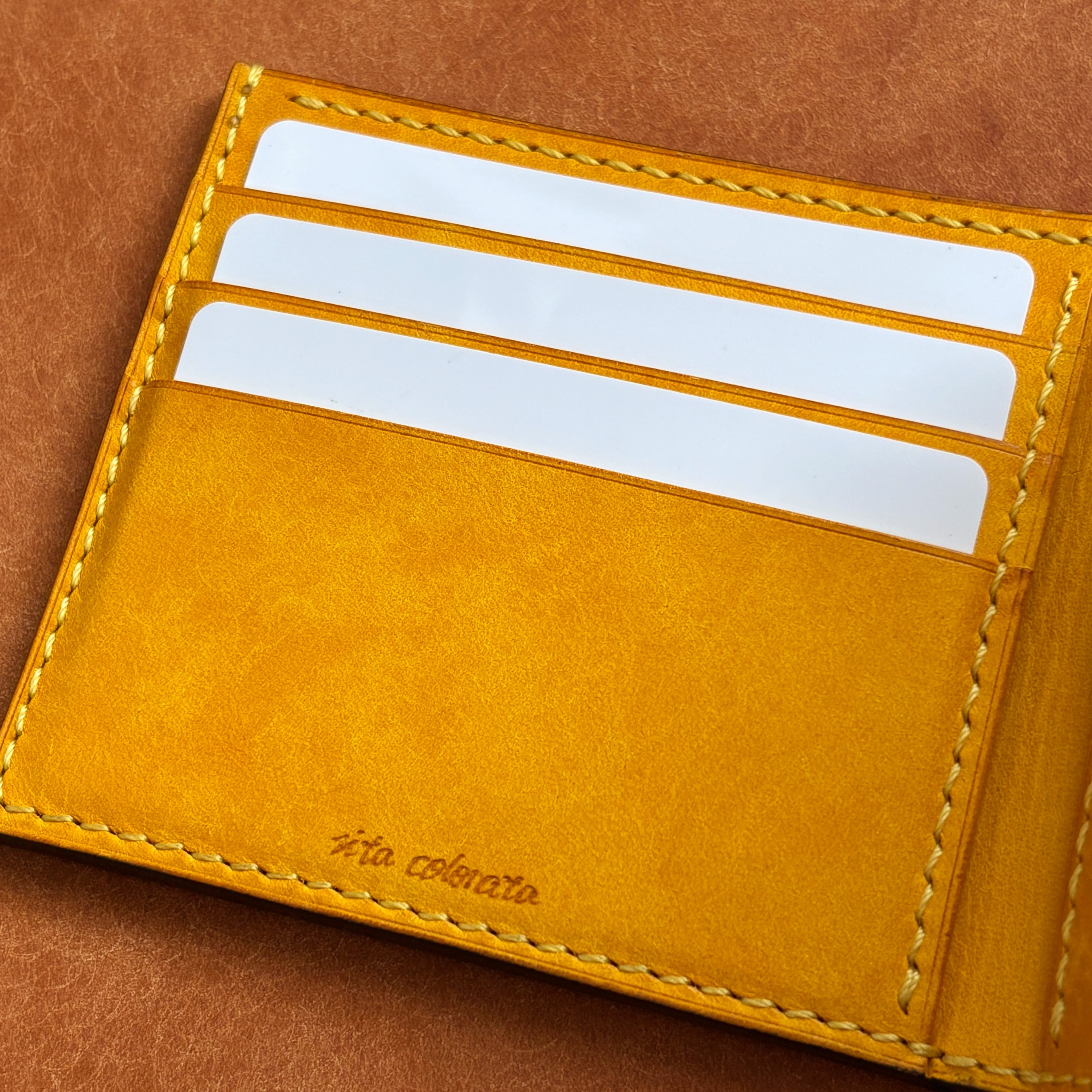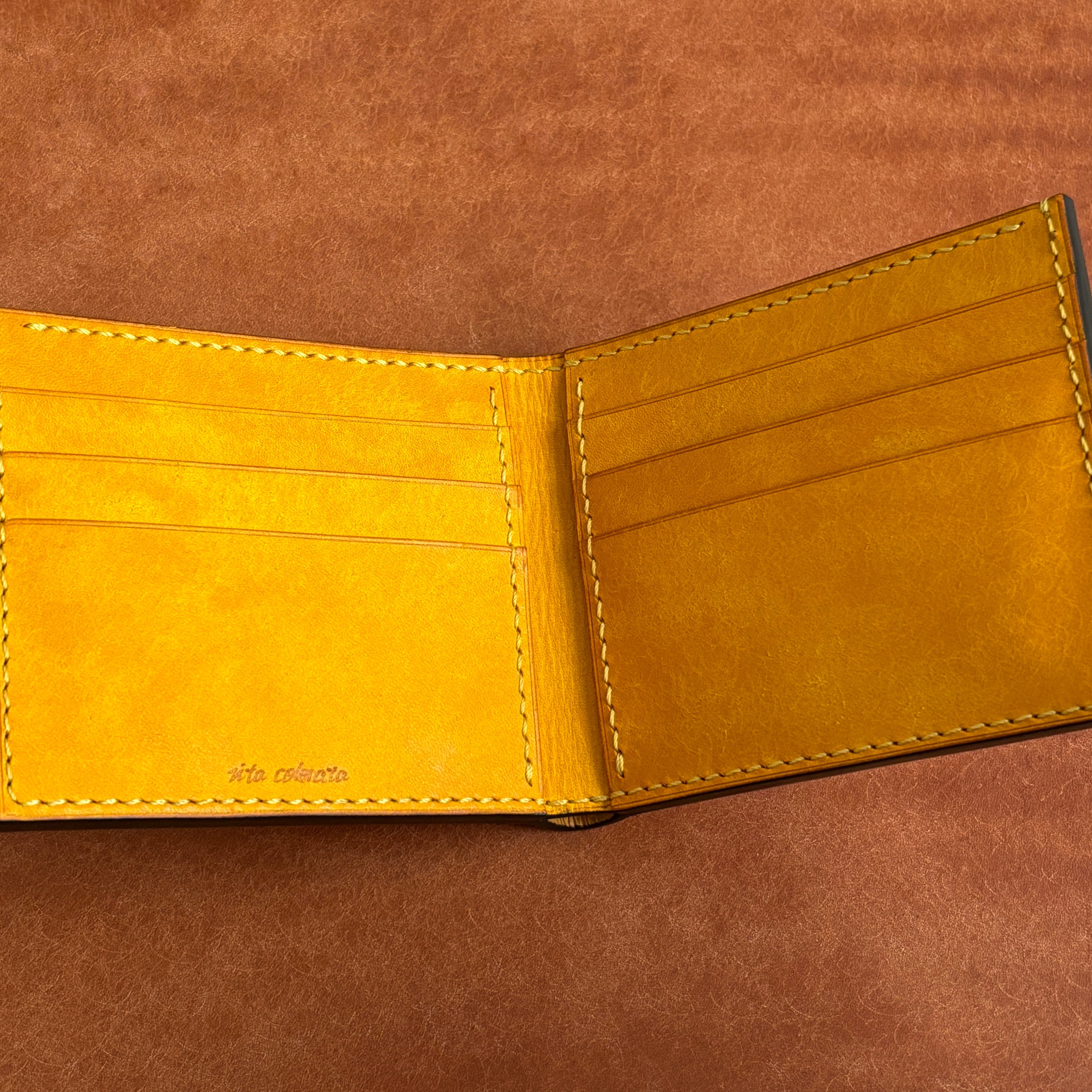 こちらは、定番で販売している二つ折り財布をベースに、小銭入れを省いた仕様で制作したセミオーダーの一点物です。