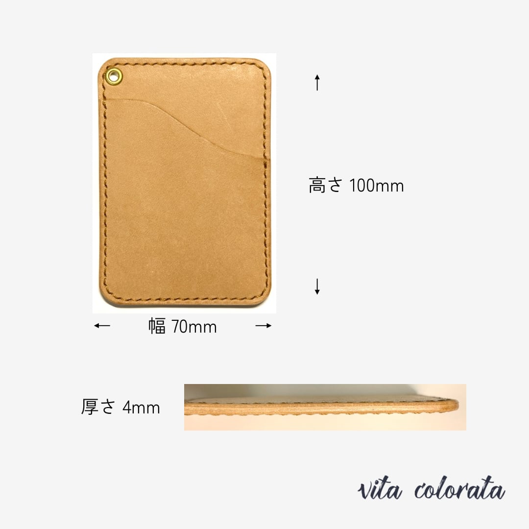 1枚のカードを収納できるデザインで、交通系ICカードや定期券をスムーズに入れることができます。少し大きめのカードも収納できる余裕がございます。ハトメが付いているため、引っかけてお使いいただくことができます。